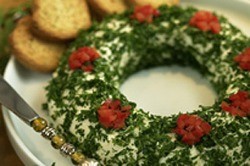 - Using your hand, lightly press the chopped parsley leaves on the cheese ball wreath to cover it.